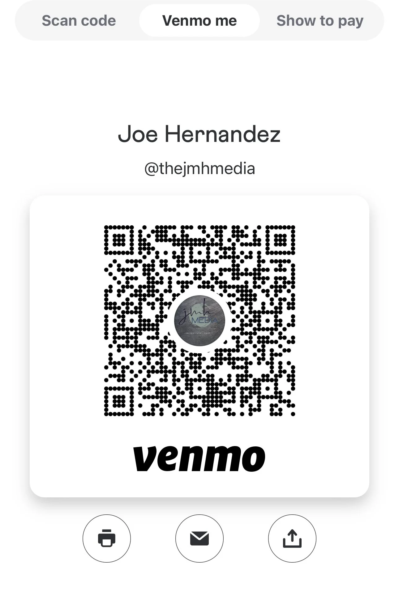 Payment can be made via Venmo (@thejmhmedia) or see QR Code below. We can also invoice via Quickbooks to pay via credit card. If you have any questions please feel free to email Joe at Joe.Hernandez@thejmhmedia.com